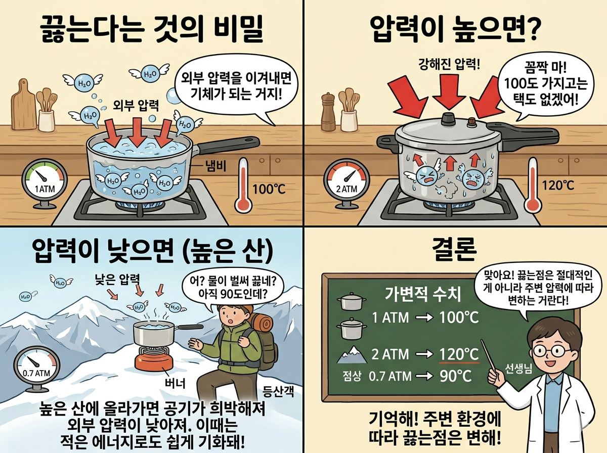 액체가 끓는다는 것은 액체 내부의 분자들이 액체 표면을 누르는 외부의 압력을 이겨내고 기체 상태로 변하는 현상을 의미합니다. 여기서 핵심은 기압입니다. 액체 표면에 가해지는 압력이 강해질수록, 분자들이 밖으로 튀어나가기 위해서는 더 큰 에너지가 필요하게 됩니다. 결과적으로 더 많은 열을 가해야 하므로 끓는 온도가 높아지는 것입니다.